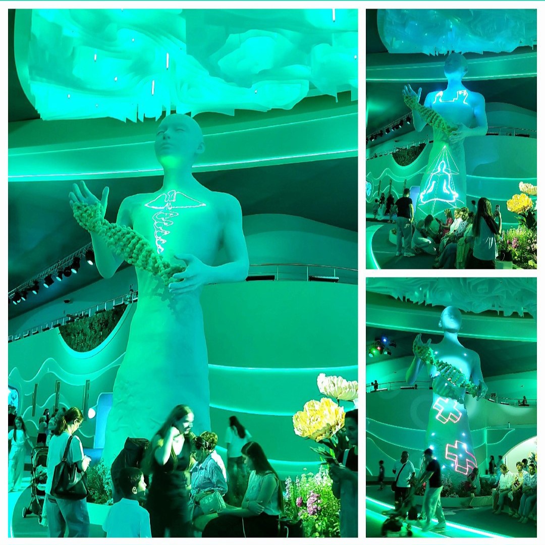 В этот раз форум-фестиваль Территория будущего Москва 2030" посвящен человеку будущего. A тема площадки в Гостином Дворе — "Бесконечное развитие с вечными ценностями”. На потолке главного экспозиционного зала, находится подсвеченный знак бесконечности, под которым в самом центре стоят четыре атланта. Каждый из них держит символ одной из ключевых ценностей общества. Красное сердце означает любовь зеленая спираль ДНК — здоровье, оранжевая книга — знания, синий город с небоскребами и шестеренками — технологии. Эти гиганты направляют посетителей в четыре соответствующих тематических раздела форума-фестиваля